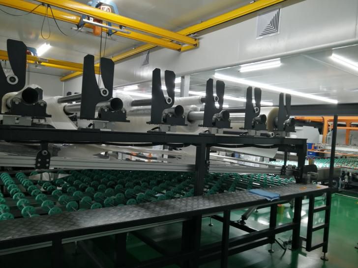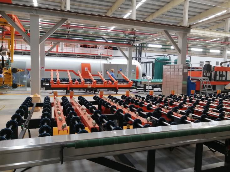 主要由自動上片臺、清洗干燥機(jī)、合片定位輸送機(jī)、自動行走吸盤吊架、PVB 膠膜鋪攤機(jī)、合片房、預(yù)壓機(jī)、下片臺、蒸壓釜等組成。